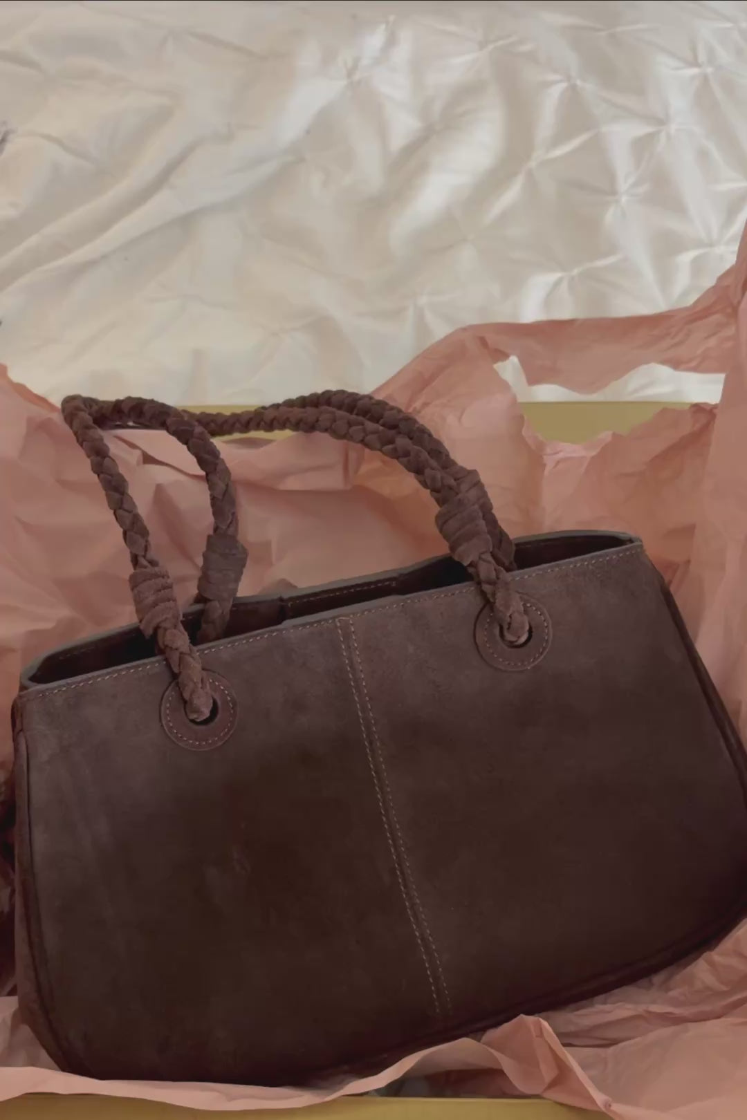 Shoulder bag in rich brown suede with braided handles and soft baby-pink satin lining.